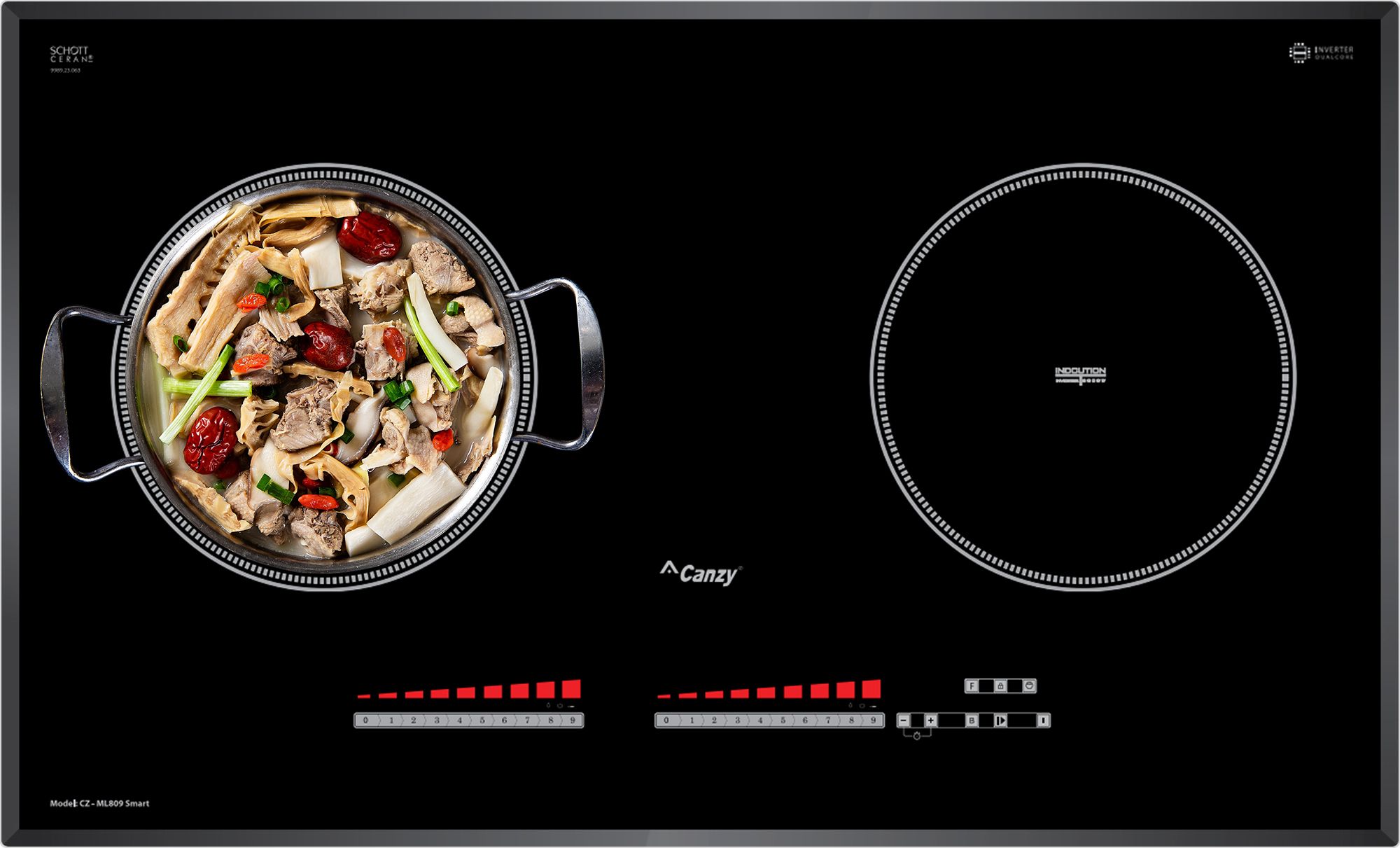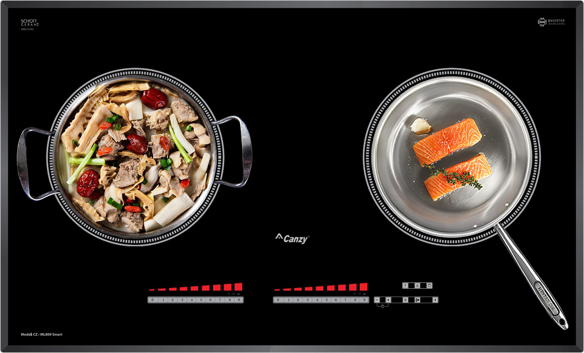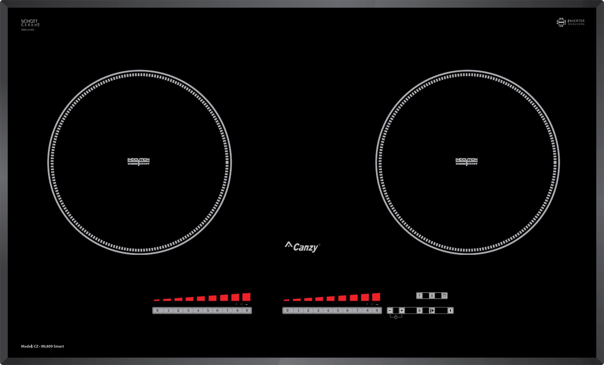 Bếp từ Canzy CZ-ML809Smart được tích hợp chức năng tự nhận diện vùng nấu, khi ta đặt nồi lên 1 trong 2 vùng nấu sau đó ấn nút khởi động bếp sau thời gian 1-2 giây bếp sẽ tự động tìm vùng nấu đã có nồi, ta chỉ việc điều chỉnh mức công suất to nhỏ theo ý muốn mà không phải thao tác chọn vùng nấu như bếp thông thường. Công nghệ Inverter được áp dụng trên bếp từ Canzy CZ-ML809Smart có khả năng phản ứng thay đổi công suất theo điều khiển ngay tức thì, khi người dùng điều chỉnh tăng giảm nhiệt độ đun nấu, bếp điều chỉnh thay đổi tức thì về mức nhiệt độ mong muốn.