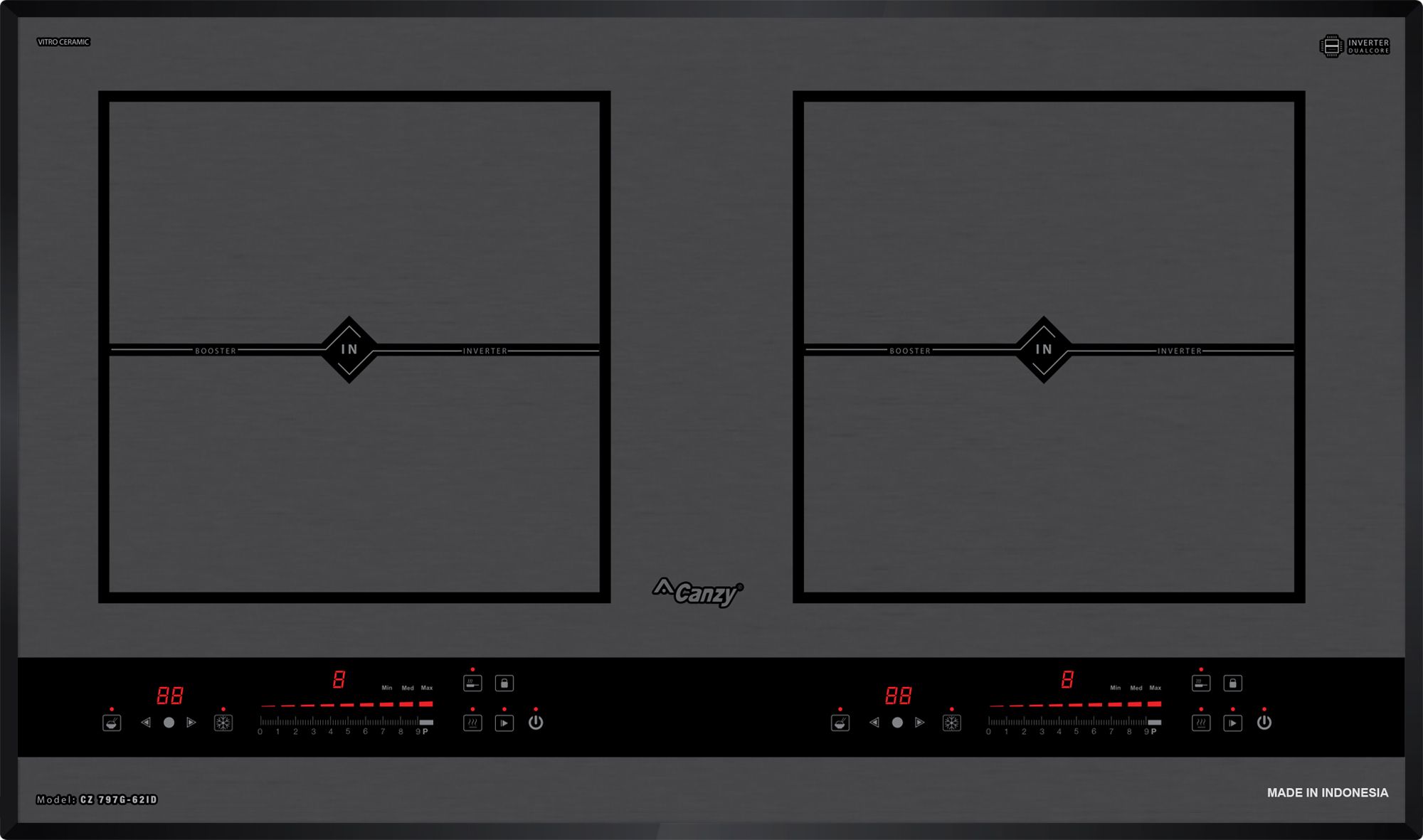 Bếp từ Canzy CZ 797G-62ID được tích hợp chức năng tự nhận diện vùng nấu, khi ta đặt nồi lên 1 trong 2 vùng nấu sau đó ấn nút khởi động bếp sau thời gian 1-2 giây bếp sẽ tự động tìm vùng nấu đã có nồi, ta chỉ việc điều chỉnh mức công suất to nhỏ theo ý muốn mà không phải thao tác chọn vùng nấu như bếp thông thường. Công nghệ Inverter được áp dụng trên bếp từ Canzy CZ 797G-62ID có khả năng phản ứng thay đổi công suất theo điều khiển ngay tức thì, khi người dùng điều chỉnh tăng giảm nhiệt độ đun nấu, bếp điều chỉnh thay đổi tức thì về mức nhiệt độ mong muốn.