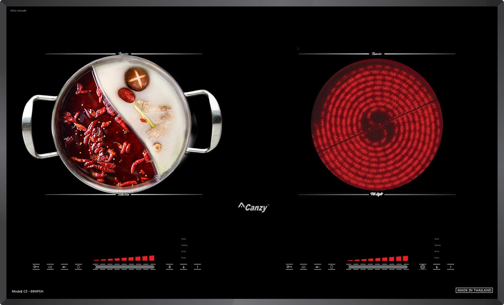 Bếp điện từ Canzy CZ-88NPSH gồm 2 vùng nấu với tổng công suất chia sẻ là 4800W. Vùng nấu trái với công suất là 2000W khi kích hoạt tính năng nấu siêu nhanh Booster công suất lên tới 2600W. vùng nấu hồng ngoại phải sử dụng mâm nhiệt Hi-light với mức công suất tối đa là 2600W.. Chức năng Booster nấu siêu nhanh, tuy nhiên thời gian tối đa mặc định dùng chức năng này là 10 phút/lần tránh quá tải.