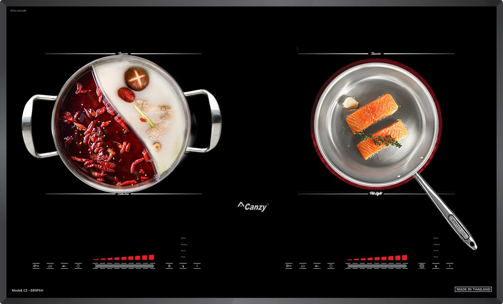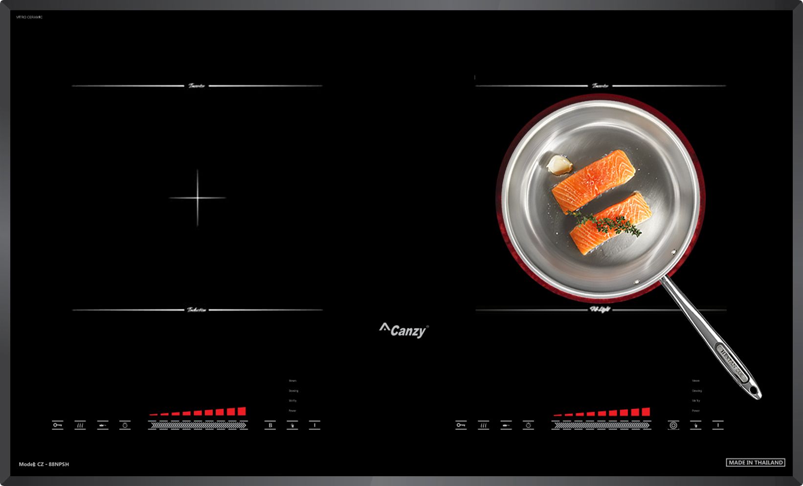 Tự động phát hiện vùng nấu và vùng nấu chỉ nóng lên khi có nồi: Các sản phẩm bếp điện từ của Canzy bao gồm CZ-88NPSH sẽ chỉ khởi động công suất khi nồi được đặt lên vùng nấu, trường hợp chưa đặt nồi khi đã khởi động, bếp sẽ không đóng công suất và cảnh báo mã lỗi không có nồi hoặc nồi không phù hợp.