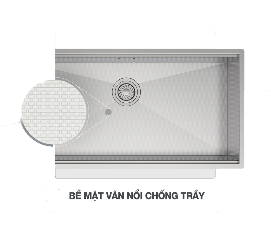Công nghệ dập vân nổi giúp hạn chế tối đa các tác nhân gây trầy xước như bùi nhùi sắt hay đồ dùng làm bếp va chạm khi sử dụng hàng ngày, giữ cho chậu luôn sáng bóng như mới.