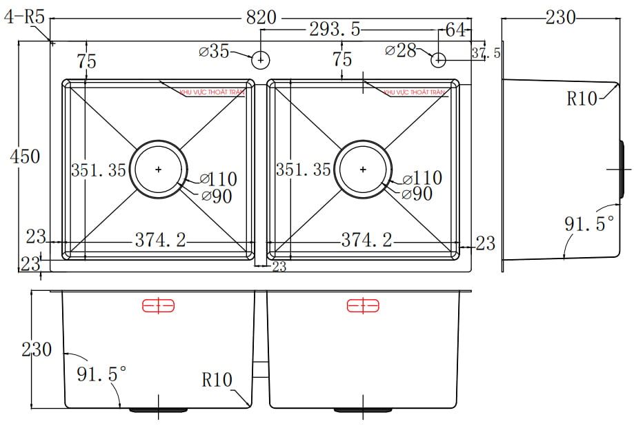 - Chậu dày 0.8 mm khá cứng cáp, không bị biến dạng dưới các tác động ngoại lực mạnh. Lòng chậu sâu nên chứa được nhiều bát đĩa hơn, hạn chế bắn nước.