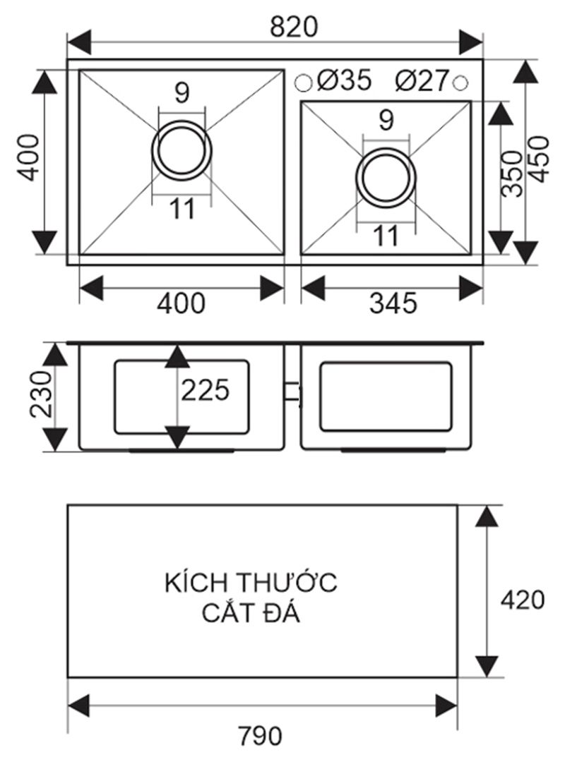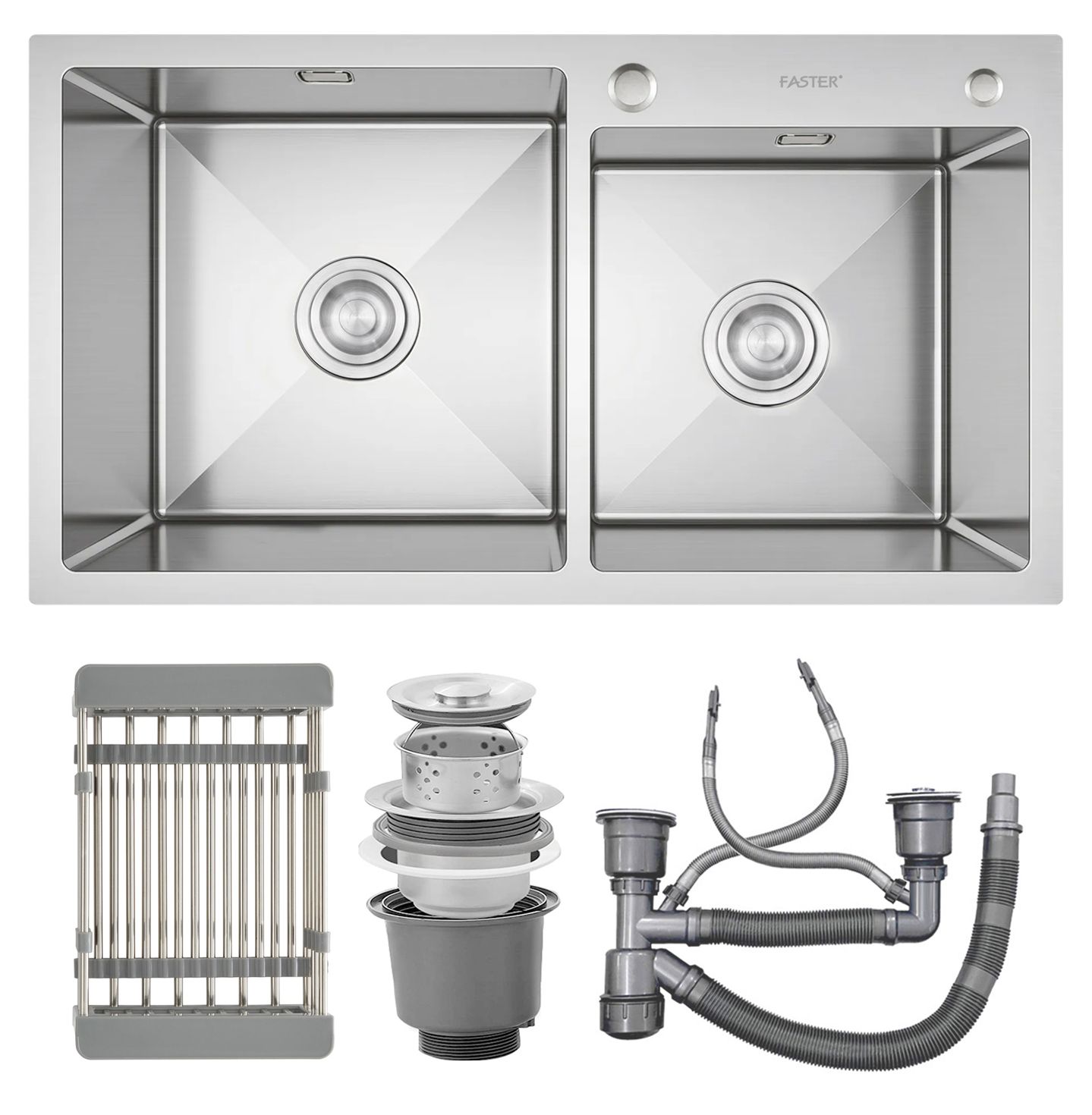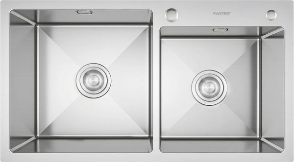 Chậu rửa bát Faster FS 8245HS gây ấn tượng bởi thiết kế vuông vức khá đặc trưng, bao gồm 2 hố rửa lệch (1 to 1 nhỏ), cho phép lắp vòi dễ dàng với tích hợp sẵn lỗ khoét tròn nằm bên phải, phía trên thành chậu.