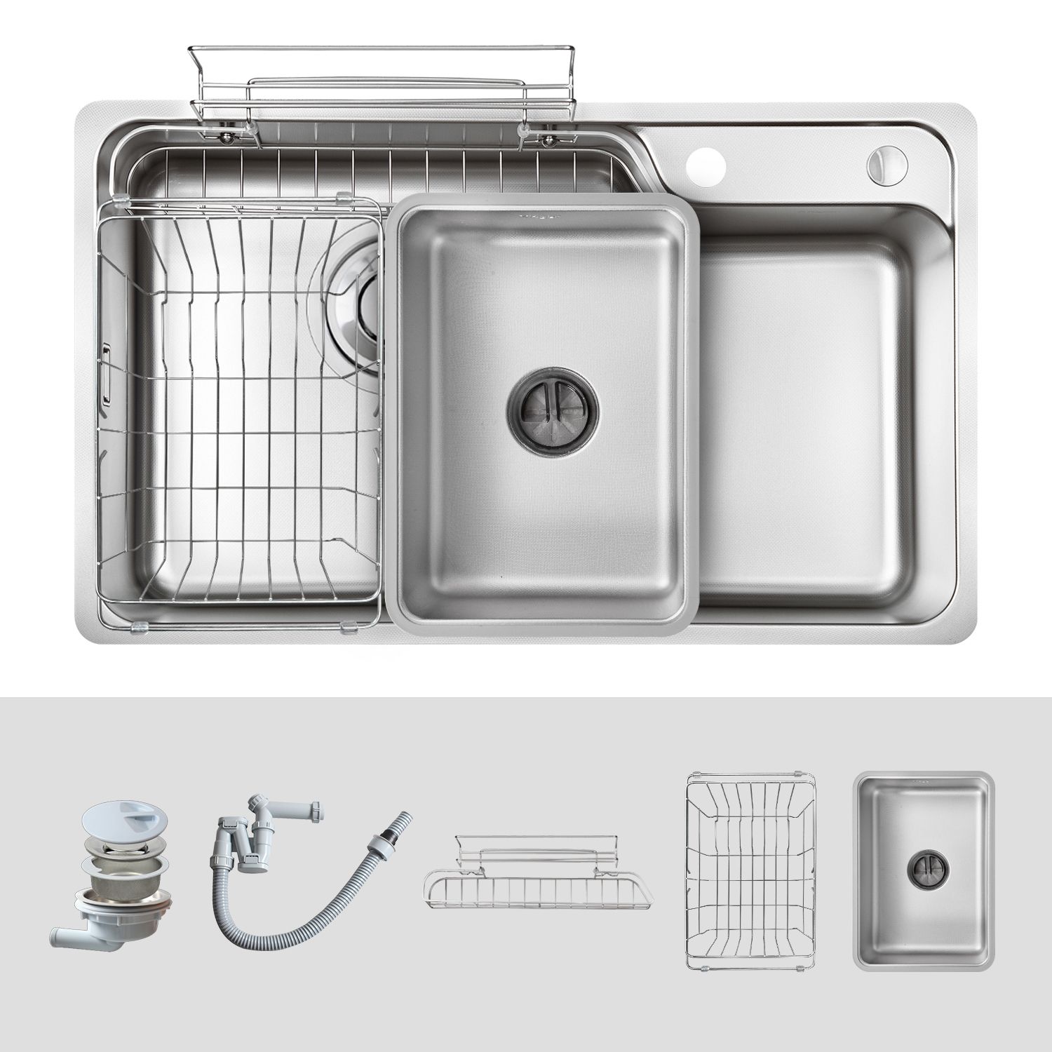 Bát rác 03 lớp đường kính lớn: Thiết kế tối ưu với 03 lớp kết hợp đường kính miệng lên đến 185mm mang đến khả năng lọc triệt để, giữ lại toàn bộ cặn bẩn và thoát hết nước, chống tắc nghẽn, đảm bảo cho hệ thống thoát nước vận hành trơn tru, giữ cho chậu bếp luôn khô thoáng, sạch sẽ.