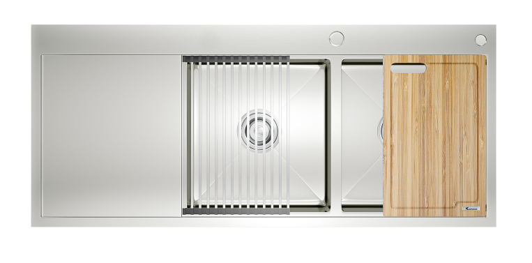 Chậu rửa bát Workstation Sink – Topmount Sink KN11650TD là sản phẩm duy nhất trong bộ sưu tập chậu handmade có tích hợp bàn chờ – một cải tiến mới về cả thẩm mỹ và công năng từ Konox.
