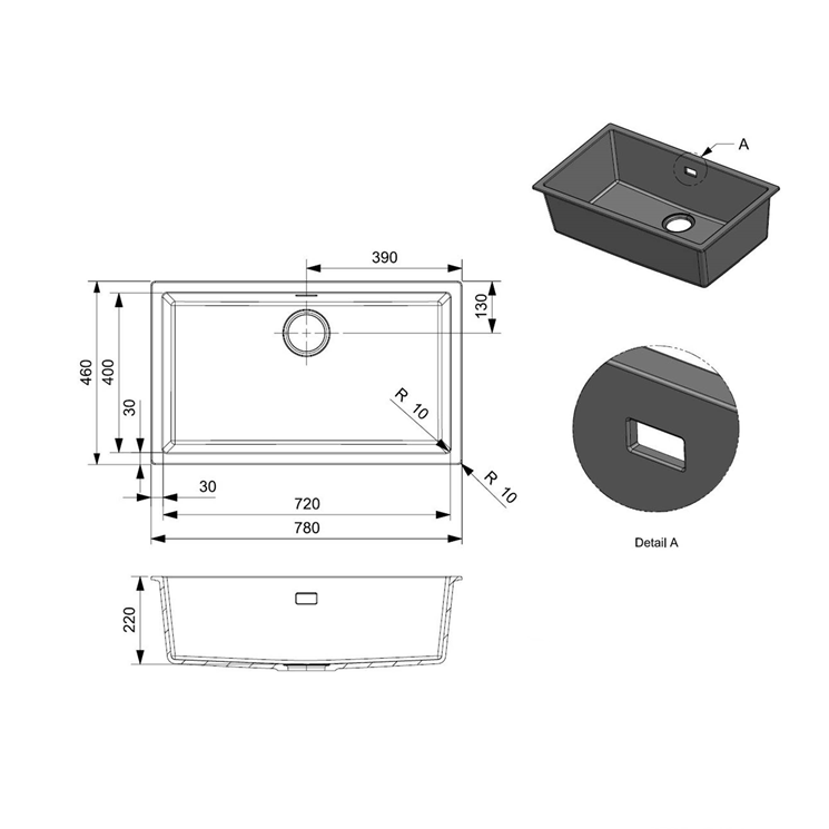 Kích thước hố rửa R30899 là 720 x 400 mm (RxS). Với chậu 1 hố rộng sẽ giúp bạn để vừa những vật dụng có kích thước lớn như nồi, xoong, chảo,…
