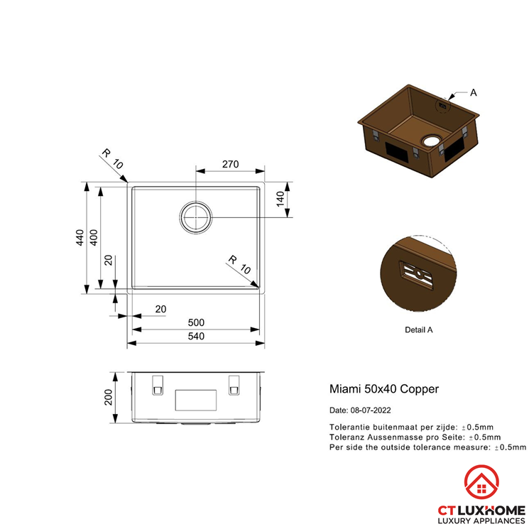 Kích thước của chậu rửa chén bát Miami 50×40 R30738 (CxRxS): 200 x 540 x 440 (mm).