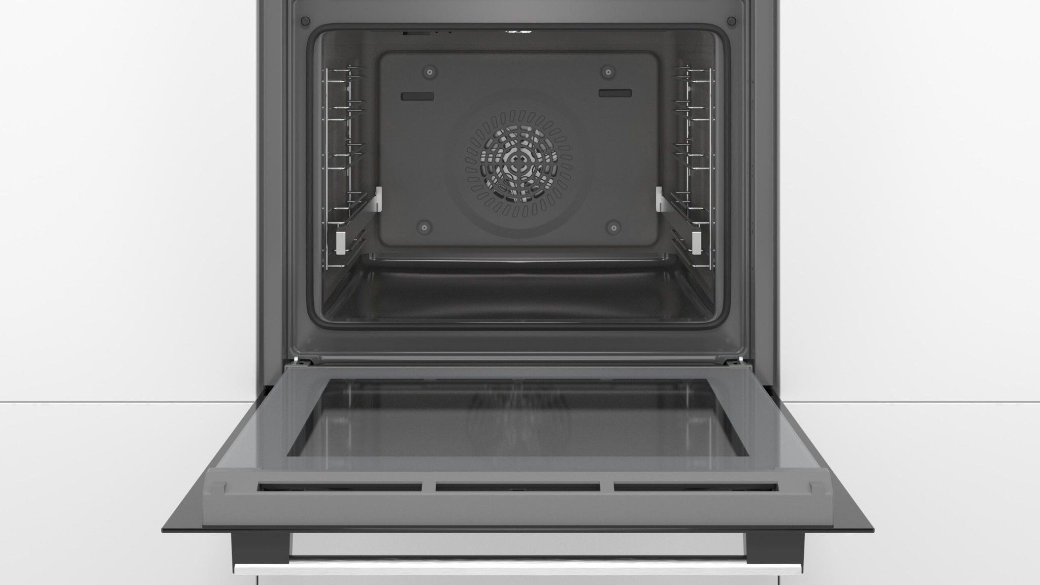 Nút nhấn mở cửa: Giúp dễ dàng vệ sinh mặt trước của lò nướng Bosch HBA5570S0B và mang lại vẻ ngoài sáng bóng cho lò.