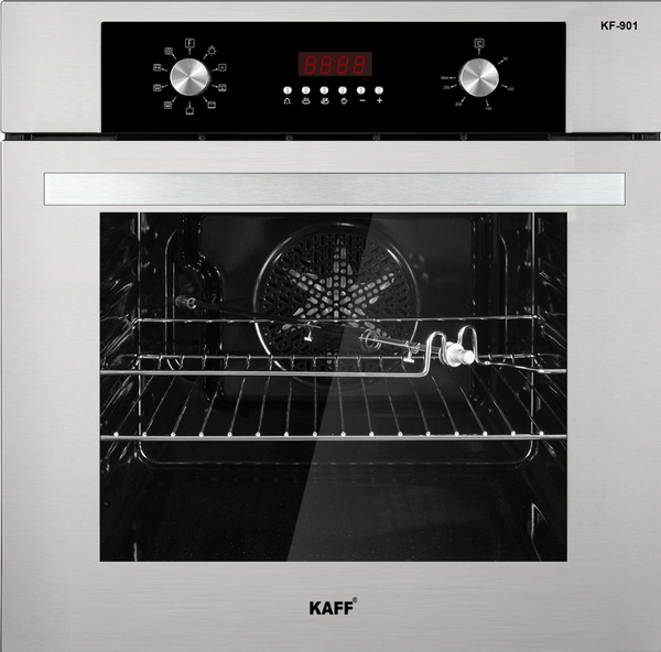 Lò nướng Kaff KF-901 nhập khẩu nguyên chiếc từ Malaysia là sản phẩm lò nướng cao cấp, dung tích 60L và phù hợp sử dụng cho đại đa số gia đình Việt. Với thiết kế sang trọng, sử dụng vật liệu cao cấp nhất trong ngành thực phẩm là Inox 304 (18/10) kết hợp kính cường lực đen chống bám bẩn và vân tay, tạo vẻ ngoài sang trọng và cuốn hút. Lò có hệ thống quạt tự làm mát hiệu quả và đèn phụ trợ chiếu sáng khoang lò.