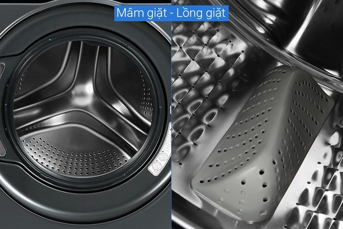 Lồng giặt của máy được làm từ chất liệu thép không gỉ, ngăn ngừa sự phát triển của vi khuẩn và nấm mốc, giúp quần áo luôn sạch sẽ, an toàn cho sức khỏe.