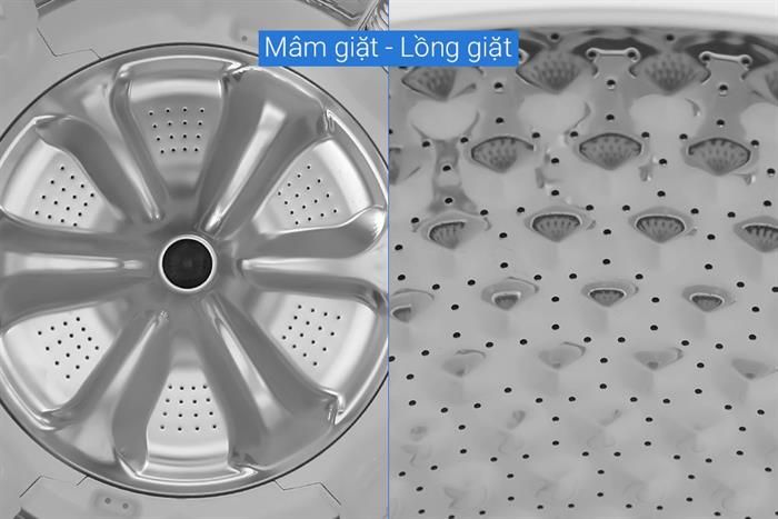 Bên trong, máy sở hữu lồng giặt ngôi sao pha lê được làm bằng thép không gỉ. Dạng lồng giặt này không chỉ có độ bền cao mà còn hỗ trợ tốt trong việc làm sạch và chăm sóc sợi vải.