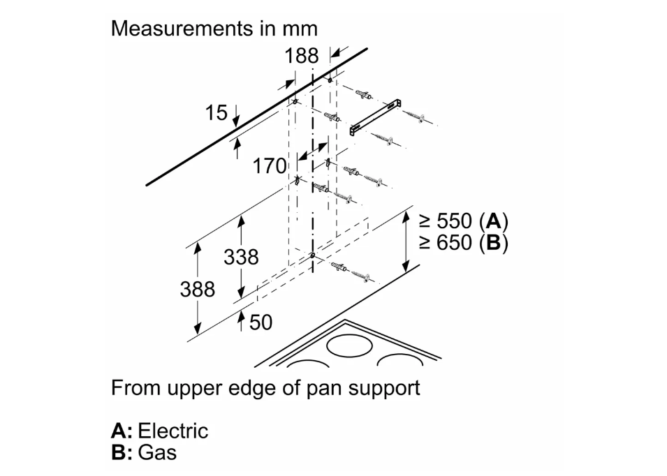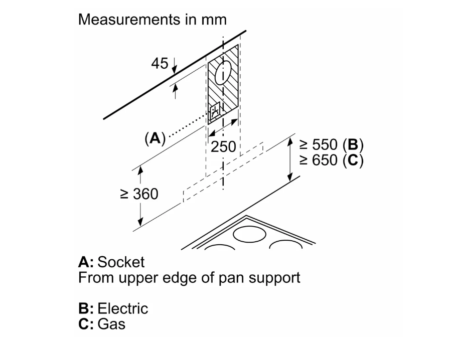| Khoảng cách tối thiểu trên bếp điện | 550 mm |