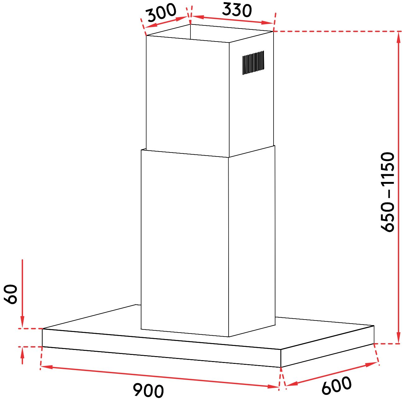 Kích thước của máy hút mùi Chefs EH-R810E9 là R900 x S600 x C(650-1150) mm.