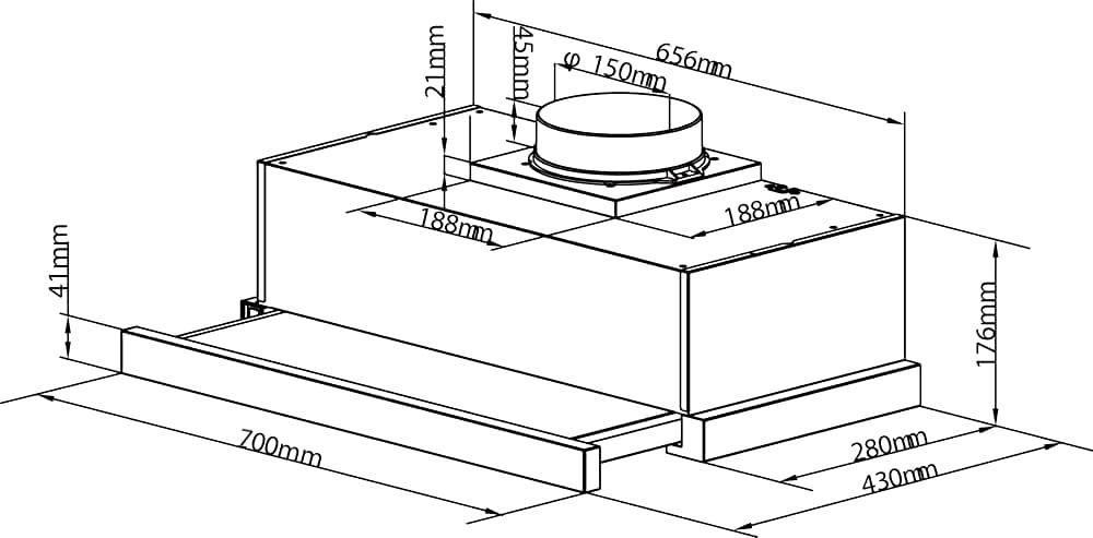 Máy hút mùi âm tủ SYP 7003 với chiều ngang 70cm cho phép hút mùi với khu vực rộng. Đồng thời, đường ống dẫn khí rộng 150mm mang đến khả năng hút mạnh mẽ và toàn diện.