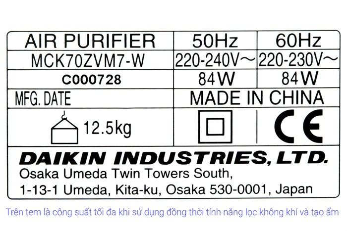 | Tiện ích | Tự khởi động lại khi mất điện; Tạo độ ẩm không khí; Hút gió 3 hướng; Bánh xe di chuyển; Đèn báo chất lượng không khí; Khoá bảng điều khiển |