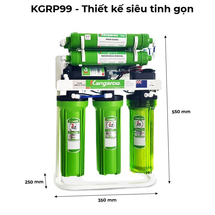 Máy lọc nước Kangaroo KGRP99 có chiều sâu là 250mm, chiều cao 550mm và chiều dài 350mm, dễ dàng lắp đặt tại mọi vị trí dưới gầm tủ bếp của gia đình, nhằm tối ưu diện tích cho căn nhà.
