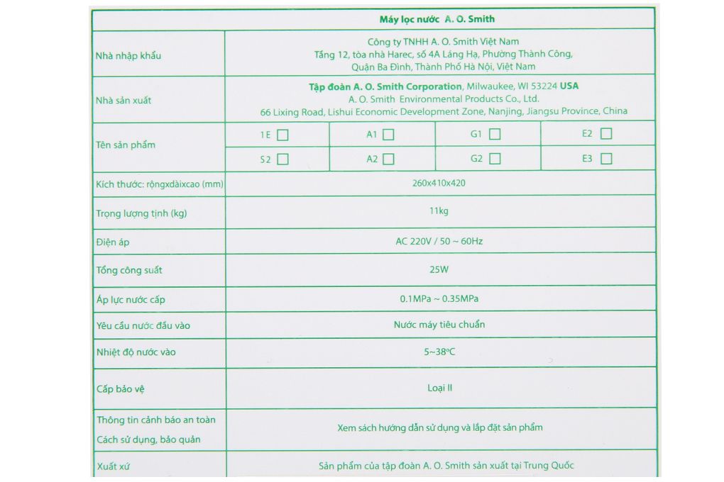 | Xuất xứ | Sản phẩm của tập đoàn A. O. Smith Corporation Sản xuất tại nhà máy A. O. Smith Environmental Products Co., Ltd., Trung Quốc |