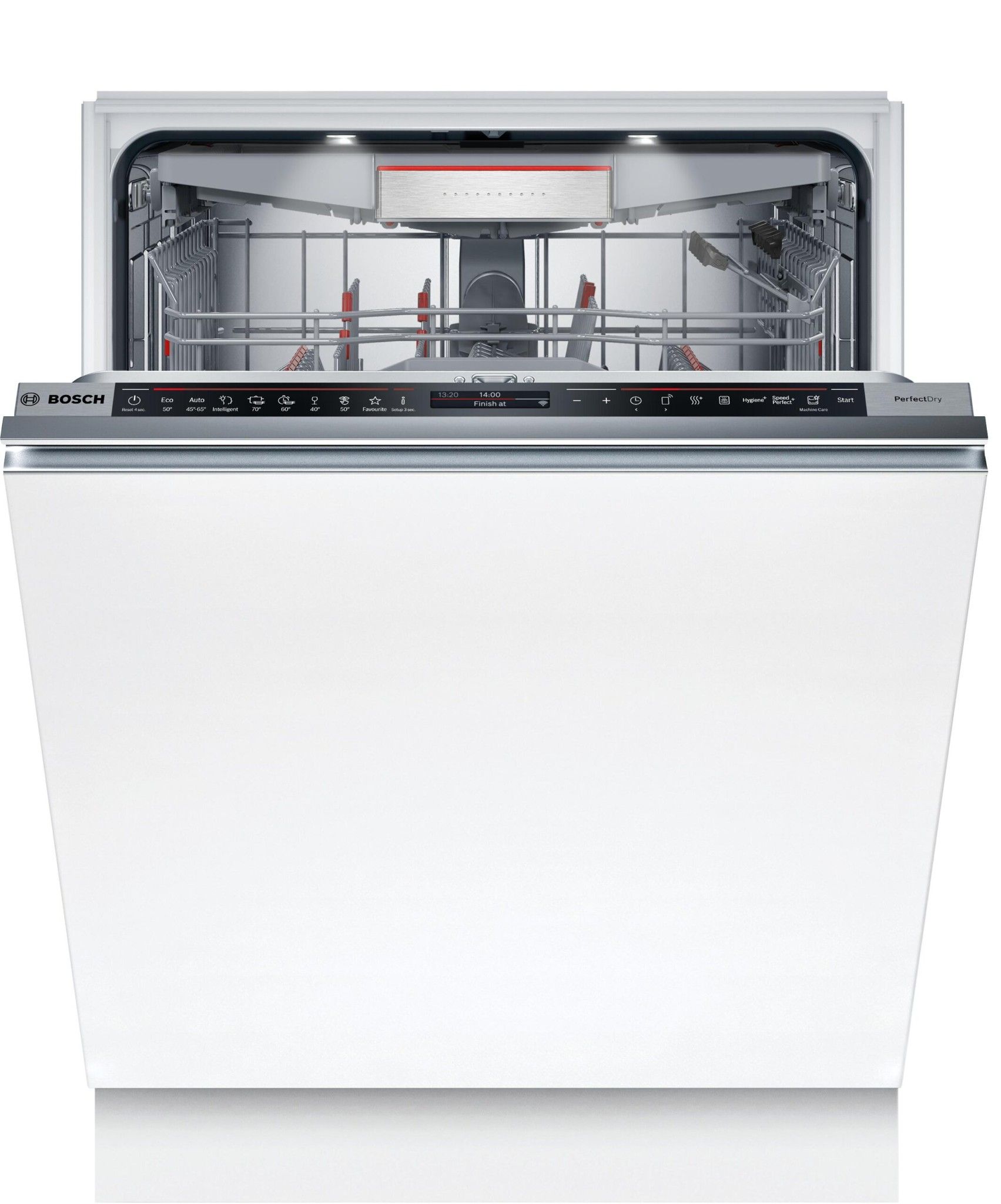 Bosch SMD8TCX04E sở hữu thiết kế âm toàn phần giúp máy hòa trộn hoàn hảo với hệ tủ bếp, mang lại sự gọn gàng, tinh tế cho không gian. Mặt trước không lộ bảng điều khiển, tạo sự tối giản, hiện đại. Hệ thống điều khiển được tích hợp bên trong và hiển thị thông tin chu trình rửa qua TimeLight, chiếu trực tiếp xuống sàn nhà, giúp bạn dễ dàng theo dõi hoạt động của máy mà không cần mở cửa.