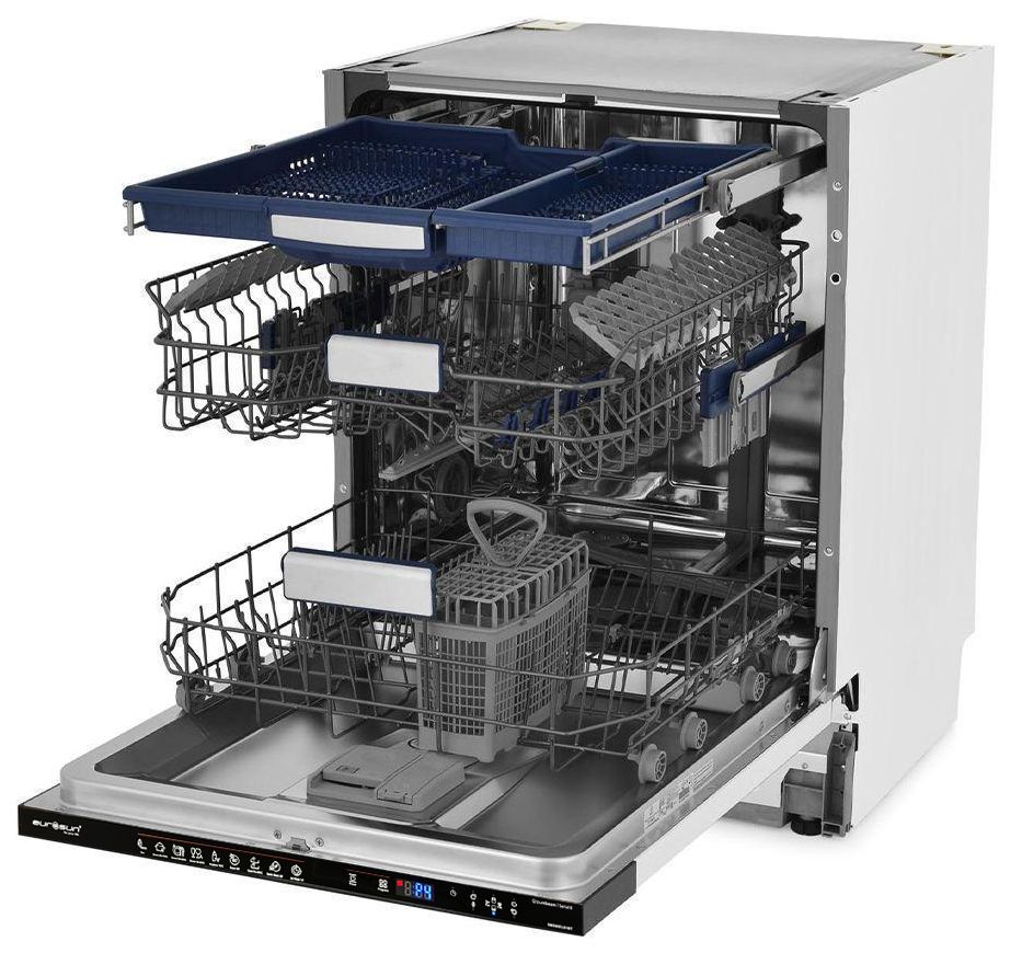 Máy rửa bát Eurosun SMS80EU21BT trang bị 3 ngăn chứa cơ động + 1 giỏ để đũa, ly cốc. Hệ thống ray nâng hạ Vario Space thông minh dễ dàng thay đổi chiều cao giữa các khay.