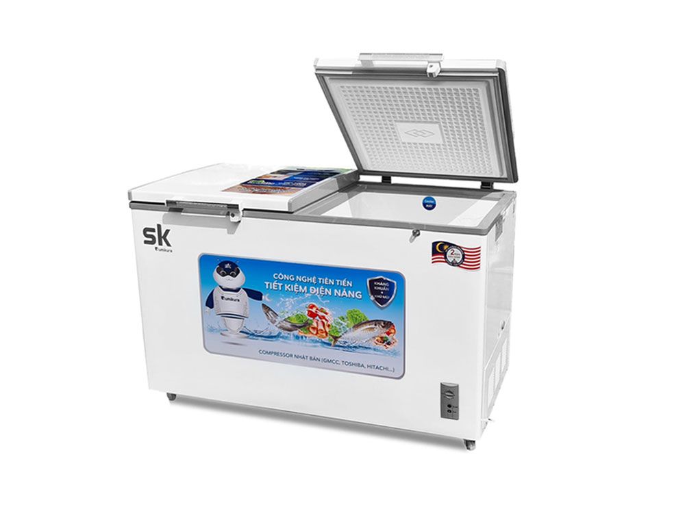 Bên cạnh đó, tủ đông 2 ngăn SK còn được trang bị thêm lớp nắp kính lùa, giúp bạn dễ dàng kiểm tra lượng thực phẩm bên trong mà không cần mở tủ, hạn chế tối đa sự thất thoát nhiệt, giúp thực phẩm tươi ngon lâu hơn và tiết kiệm điện năng khi sử dụng.