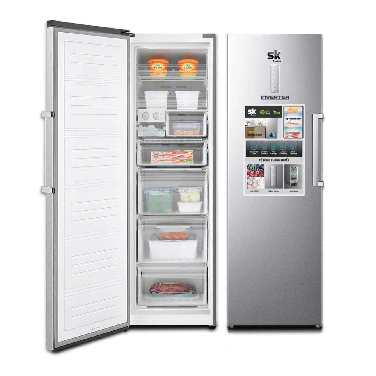 Với thiết kế tủ đứng cùng nhiều ngăn nhỏ bên trong, tủ đông đứng SKFU-350HSN.I giúp tối ưu hóa không gian, giúp bạn bảo quản được nhiều thực phẩm hơn mà không chiếm nhiều diện tích, đặc biệt thích hợp với những căn hộ nhỏ hay sử dụng kết hợp với tủ lạnh cho hộ gia đình từ 4 thành viên.
