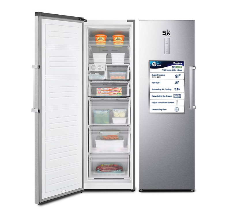 Tủ đông đứng có thiết kế đứng như 1 chiếc tủ lạnh truyền thống. Đồng thời, tủ được trang bị nhiều ngăn nhỏ bên trong tối ưu hóa không gian. Bạn có thể bảo quản nhiều loại thực phẩm hơn mà không lo thiếu diện tích.