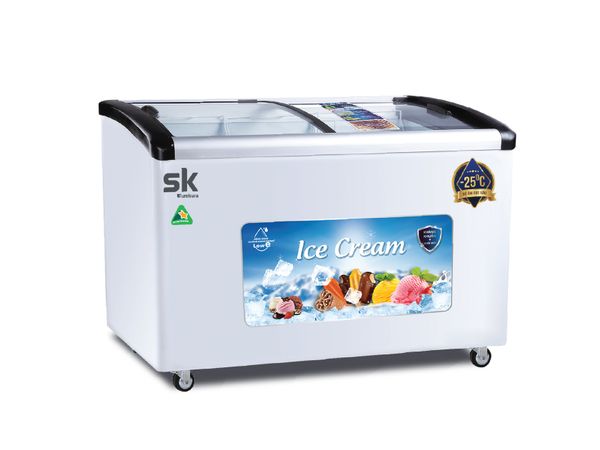 Phía bên trong lòng tủ được làm từ thép phẳng sơn tĩnh điện, bề mặt được làm từ nhựa ABS trắng hỗ trợ làm lạnh nhanh chóng. Đồng thời tạo cảm giác sạch sẽ, hợp vệ sinh. Thân tủ làm từ chất liệu tole thép dày 0.4 mm chống va đập cao. Cửa tủ mở dạng trượt thuận tiện giúp quá trình lấy, cất giữ thực phẩm thuận tiện hơn. Phần dưới chân tủ có 4 bánh xe chịu lực dễ dàng di chuyển.