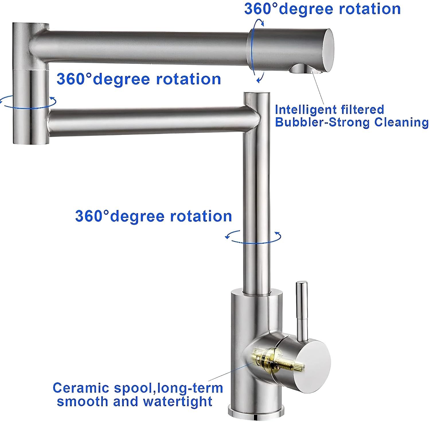 - Cấu tạo các mối nối, góc gấp khúc được thiết kế thông minh đảm bảo không rò rỉ nước trong khi hoạt động, giúp vòi xoay trở 360 độ nhẹ nhàng và linh hoạt đến mọi vị trí cần thiết.