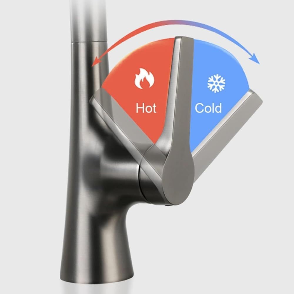 - Thiết kế hiện đại với tích hợp 2 đường nước nóng lạnh, thân vòi xoay được 360 độ và đầu vòi kéo dây dài đến 76 cm giúp mở rộng phạm vi làm việc một cách đáng kể.