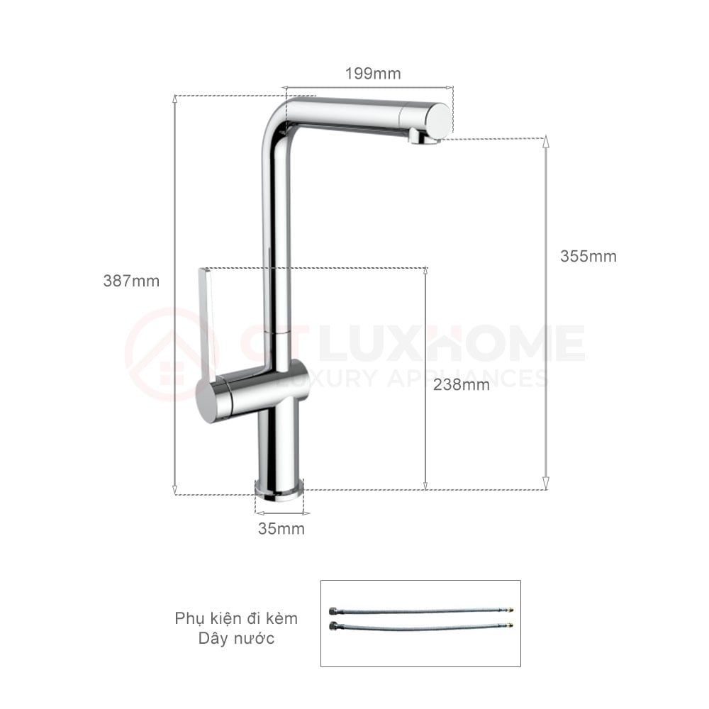 Kích thước lỗ khoét của vòi rửa bát Fusto A Furst F400552CR: đường kính 35mm và chiều cao từ mặt chậu đến thân vòi là 387mm.